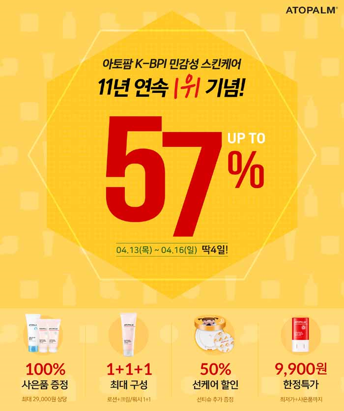 아토팜은 오는 13일부터 16일까지 4일간 브랜드데이 특별 할인 행사를 진행한다. 이번 브랜드데이 행사는 아토팜 공식 쇼핑몰 네오팜샵과 주요 소셜커머스, 온라인몰에서 이루어질 예정이며, 아토팜 수딩 젤 로션을 비롯해 아토팜 인기 제품들의 최대 57% 특별 할인과 더불어 다양한 증정 행사가 함께 진행될 예정이다.