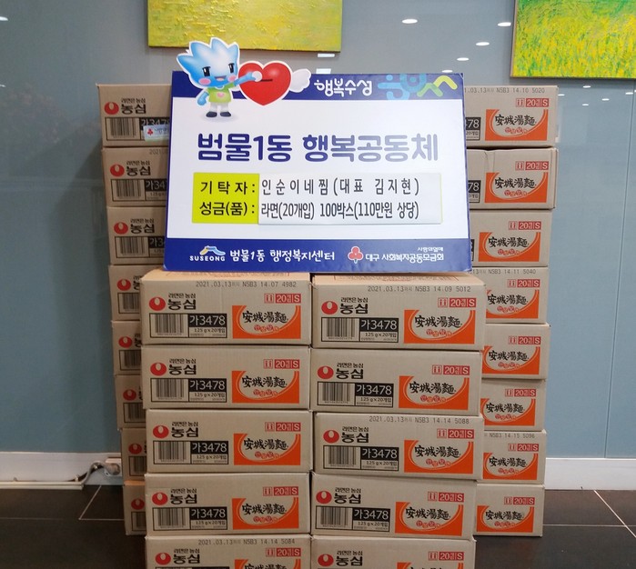 [로컬세계 박세환 기자]대구 수성구 범물1동 소재 인순이네찜식당(대표 김지현)은 최근 범물1동 행정복지센터를 방문해 추석을 맞아 어려운 이웃을 위해 써달라며 라면 100박스(110만원 상당)를 전달했다.