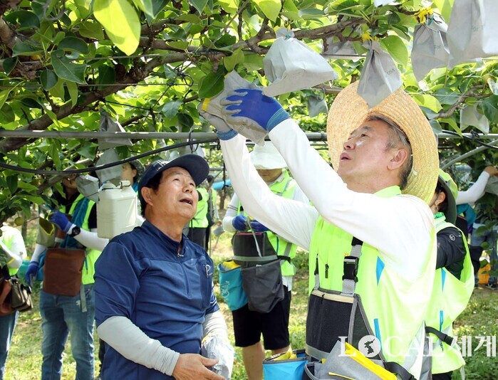 ▲농협중앙회는 부족한 영농인력의 심각성을 국민들에게 알리고 관심과 참여를 확산하기 위하여 6월 14일을 「한마음 농촌 일손돕기」의 날로 정하고 계열사 및 자회사, 지역농축협 등 약 일만여 명의 임직원들이 전국적으로 일손돕기를 실시했다. 14일 안성 대덕면 일대에서 진행한 일손돕기 행사에서 강호동 회장이 배 봉지 씌우기를 하고 있다. |