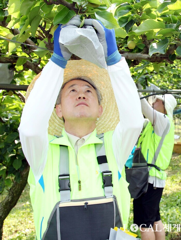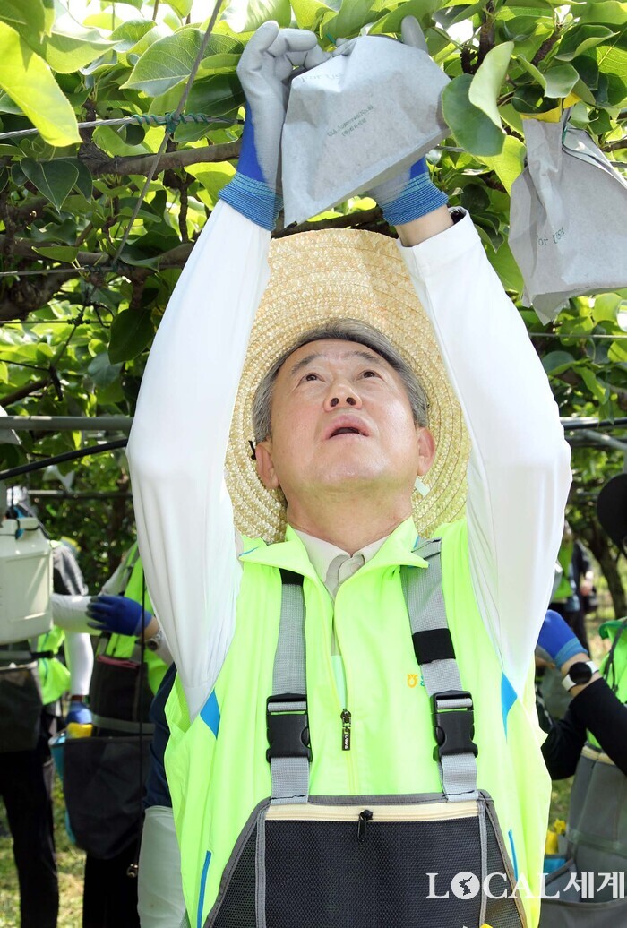 ▲농협중앙회는 부족한 영농인력의 심각성을 국민들에게 알리고 관심과 참여를 확산하기 위하여 6월 14일을 「한마음 농촌 일손돕기」의 날로 정하고 계열사 및 자회사, 지역농축협 등 약 일만여 명의 임직원들이 전국적으로 일손돕기를 실시했다. 14일 안성 대덕면 일대에서 진행한 일손돕기 행사에서 강호동 회장이 배 봉지 씌우기를 하고 있다.