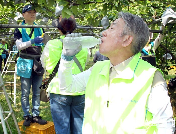 ▲농협중앙회는 부족한 영농인력의 심각성을 국민들에게 알리고 관심과 참여를 확산하기 위하여 6월 14일을 「한마음 농촌 일손돕기」의 날로 정하고 계열사 및 자회사, 지역농축협 등 약 일만여 명의 임직원들이 전국적으로 일손돕기를 실시했다. 14일 안성 대덕면 일대에서 진행한 일손돕기 행사에서 강호동 회장이 일손돕기를 하며수분을 보충하고 있다. |