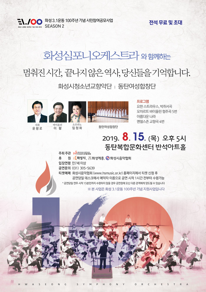13일 시에 따르면 화성 3.1운동 100주년 기념 시민참여공모사업 일환으로 마련된 ‘화성심포니오케스트라와 함께하는 멈춰진 시간, 끝나지 않은 역사, 당신들을 기억합니다’는 나라와 주권을 되찾은 광복절을 맞아 시민과 함께 화성 3.1운동을 기억하는 시간을 갖고자 기획됐다.