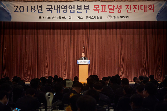 지난 9일 서울 롯데호텔월드에서 열린 2018년 쌍용차 국내영업본부 목표달성 전진대회에는 쌍용차 최종식 대표이사, 국내영업본부장 송영한 부사장를 비롯한 본부별 임직원 및 전국 판매 대리점 대표 등 280여 명이 참석했다.
