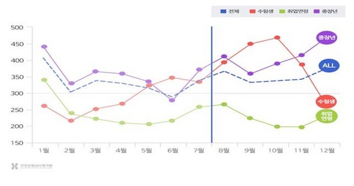 또한 취업연령층은 전체 진료인원의 패턴과 비슷하지만 평소에 비해 연초에 진료인원이 크게 늘어나는 것으로 나타나 졸업, 취업 등으로 인한 스트레스 때문으로 추측된다.