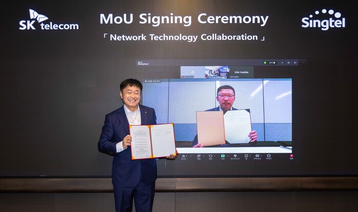 ▲ SKT는 싱가포르 1위 통신사 싱텔과 AI 기술의 통신망 적용, 5G 네트워크 슬라이싱 기술 적용사례 개발, 6G 기술 준비 등 5G 및 차세대 통신 기술 협력 업무협약(MOU)을 체결했다. SKT 제공 |