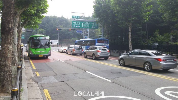 ▲서울시 강남구 구룡초등학교앞 도로에서 시내버스가 운행하고 있다. 라안일 기자. |