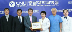 ▲건보공단 대전본부 강희권 본부장(왼쪽 세 번째)이 충남대병원 김봉옥 원장(왼쪽 네 번째)에게 위문품을 전달하고 있다. |