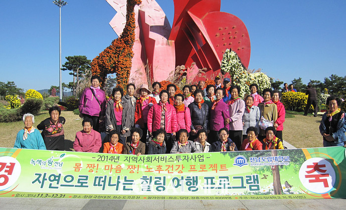 | ▲지난해 몸짱 마음짱 노후건강 프로젝트서비스 일환으로 화순 도곡운천 등을 찾은 어르신들이 기념촬영을 하고 있다. |