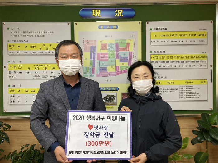 [로컬세계 박세환 기자][로컬세계 박세환 기자]대구 서구 평리4동지역사회보장협의체 노갑선 위원장은 지난 13일 평리4동 행정복지센터를 방문해 서구 학생들의 학업을 돕기 위해 평사랑 장학금 300만원을 기탁했다.