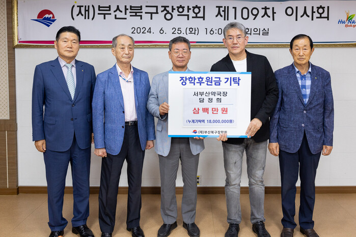 [로컬세계 부산=맹화찬 기자]부산 북구는 지난 6월 25일, 담정희 서부산약국장이 재단법인 부산북구장학회에 장학기금으로 300만원을 기탁했다고 3일 밝혔다. 지금까지 총 1800만원의 장학기금을 기탁했다.