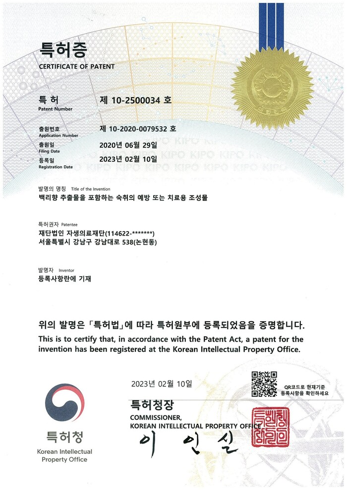 ▲자생한방병원 척추관절연구소가 취득한 ‘백리향 추출물’ 특허 |