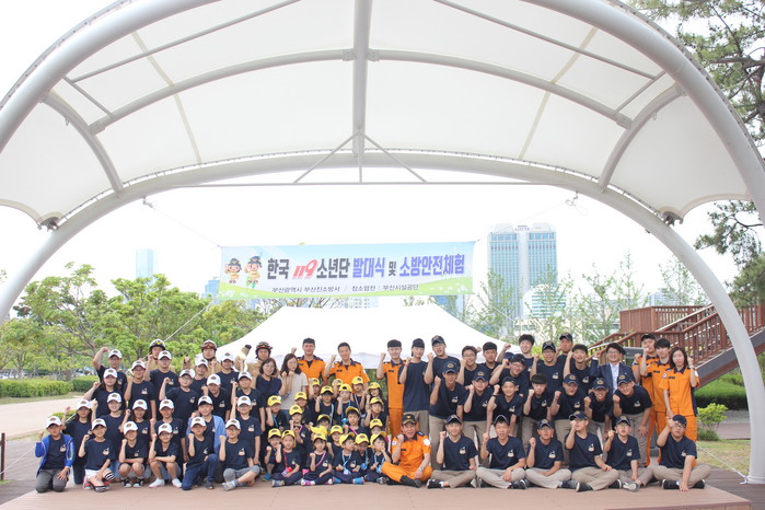 | ▲한국 119소년단이 발대식 및 소방안전체험 후 기념촬영을 하고 있다.(부산진소방서제공) |