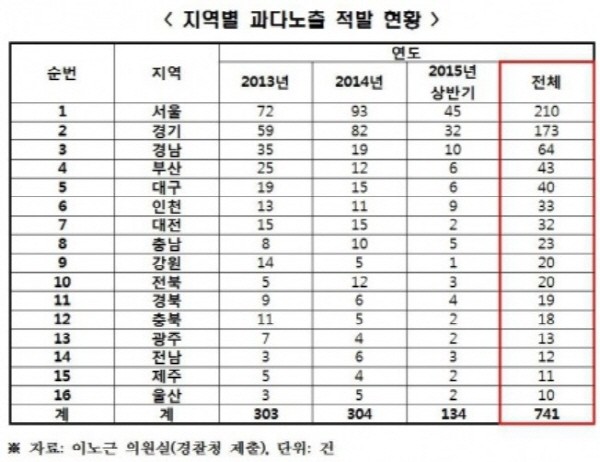 새누리당 이노근 국회의원이 경찰청으로부터 제출받아 분석한 자료에 따르면, 최근 과다노출로 적발된 범죄는 지난 2013년 303건, 2014년 304건, 2015년 6월 현재까지 134건으로 집계됐다.
