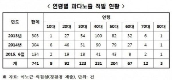 아울러, 연령별로는 40대가 231건, 50대 204건, 30대 123건, 20대 92건, 60대 67건, 70대 12건, 10대 9건, 80대 3건 순으로 적발건수가 통계된 가운데 70대 이상의 과다노출 건이 15건이나 됐다.