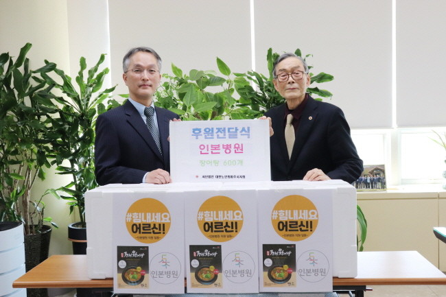 [로컬세계 최아침 기자]경기 파주시 인본병원(원장 김상범)이 코로나19 여파로 인해 노인복지관에 못 나오시는 어르신들의 건강을 기원하며 600인분의 풍천장어탕을 후원해 지역사회에 훈훈함을 전하고 있다.