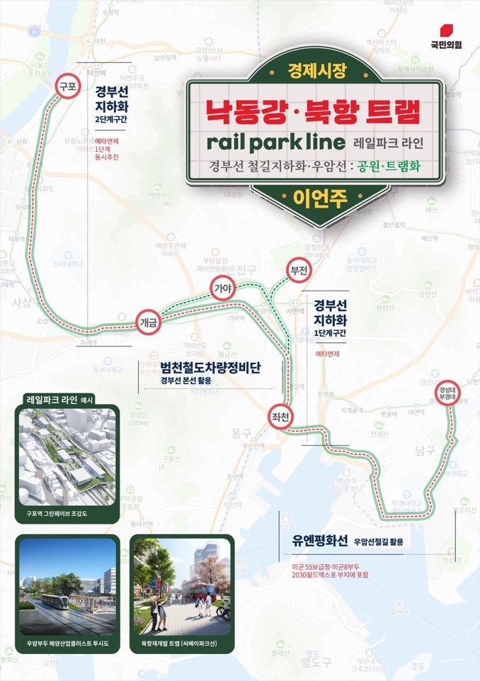 그러면서 이 예비후보는 “인구 밀집지역인 경부선 1,2단계 구간을 지하화하고 지상부를 공원으로 조성하고 트램을 설치하면 지역 주민들의 삶을 획기적으로 끌어 올릴 수 있다”며 옛 미군시설지역인 하야리아 부대 자리에 조성한 부산시민공원을 그 사례로 꼽았다.
