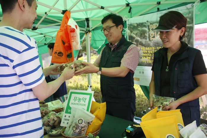 | ▲강용 친환경농산물의무자조금 관리위원장(왼쪽)이 31일 롯데프리미엄아울렛 이천점에서 개장한 ‘친환경농산물 직거래장터’에서 소비자에게 친환경농산물을 건네고 있다.(친환경농산물의무자조금 관리위원회 제공) |