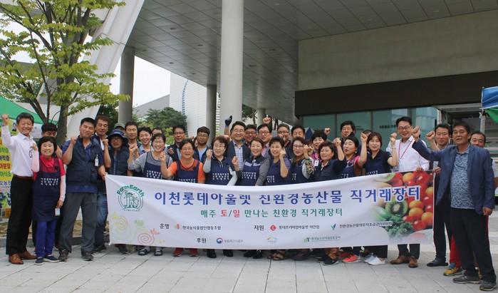 | ▲친환경농산물의무자조금(위원장 강용, 두 번째 줄 가운데)은 31일(토) 롯데프리미엄아울렛 이천점에서 친환경농산물 직거래장터를 개장했다. |