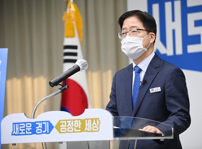 ▲16일 김규식 노동국장이 경기도청 북부청사에서 온라인 기자회견을 갖고 있다.(경기도 제공) |