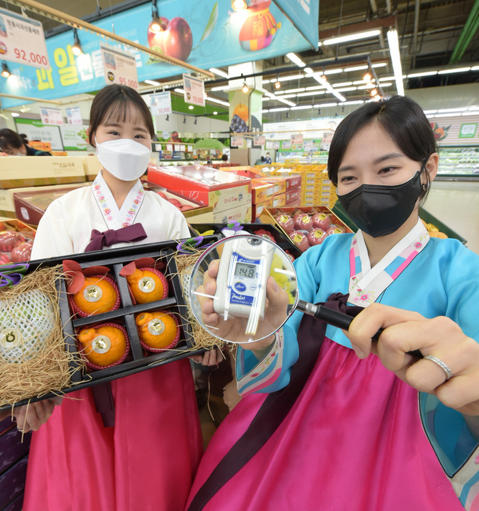 | ▲농협유통이 2일 서울 서초구 청계산로 농협 하나로마트 양재점에서 모델이 사과·배 등 과일 선물세트의 당도를 측정해 보이고 있다. |