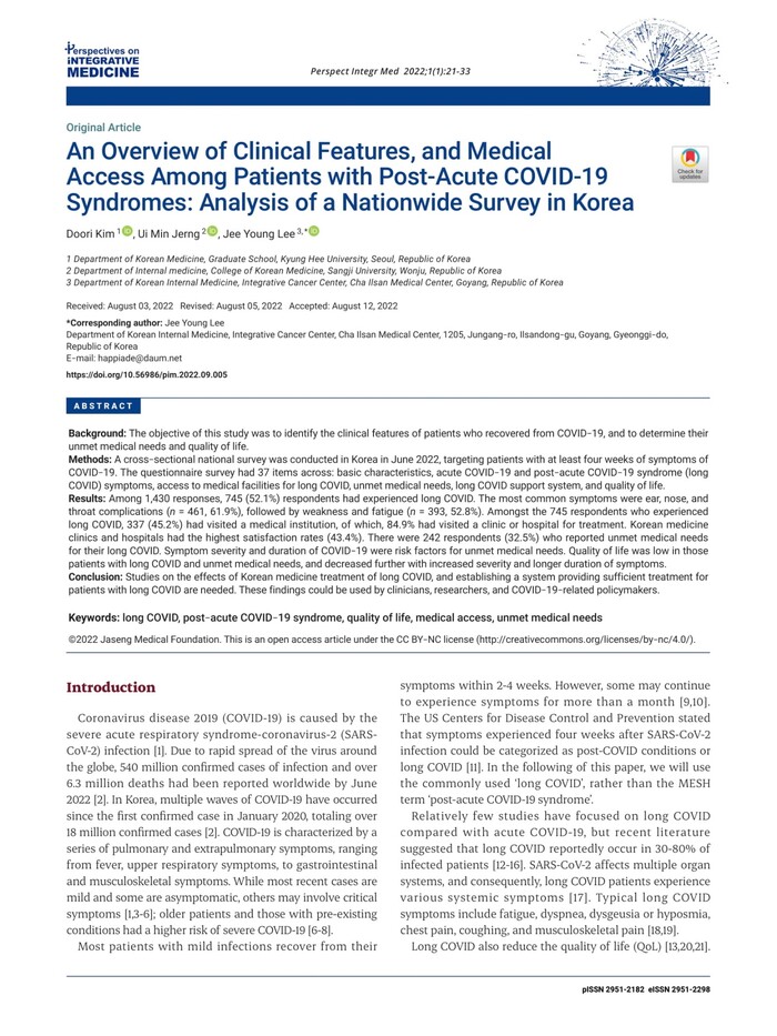 10월에 발간한 창간호에서는 신종 코로나바이러스 감염증(코로나19) 확진 후 나타나는 후유증을 주제로 한 논문들이 중점적으로 다뤄졌다. 심사를 거쳐 최종 게재된 논문은 ▲통합의학에 대한 관점 확대: 코로나19 시대의 세계 보건 증진 ▲코로나 후유증 환자의 임상적 특징 및 의료 접근 개요: 국내 전국 조사 분석 ▲코로나 후유증 한방치료 현황 ▲어깨 통증에 대한 침술의 잠재적 역할: 임상 진료 지침에 대한 문헌고찰 ▲연구와 학술교류, 의료보험 측면에서의 수기치료의 범위 확대: 두 건의 국제회의 요약 ▲침술이 신경통에 미치는 영향: 동물 모델을 활용한 기전 연구로 총 6건이다.