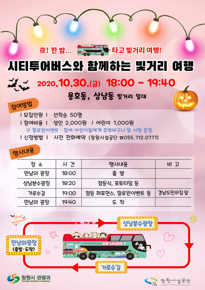 ‘시티투어버스와 함께하는 빛거리 여행’은 이달 30일 오후 6시에 2층 시티투어버스를 타고 만남의 광장에서 출발해 상남동 분수광장, 용호동 가로수길을 거쳐 오후 7시 40분 만남의 광장으로 돌아온다.