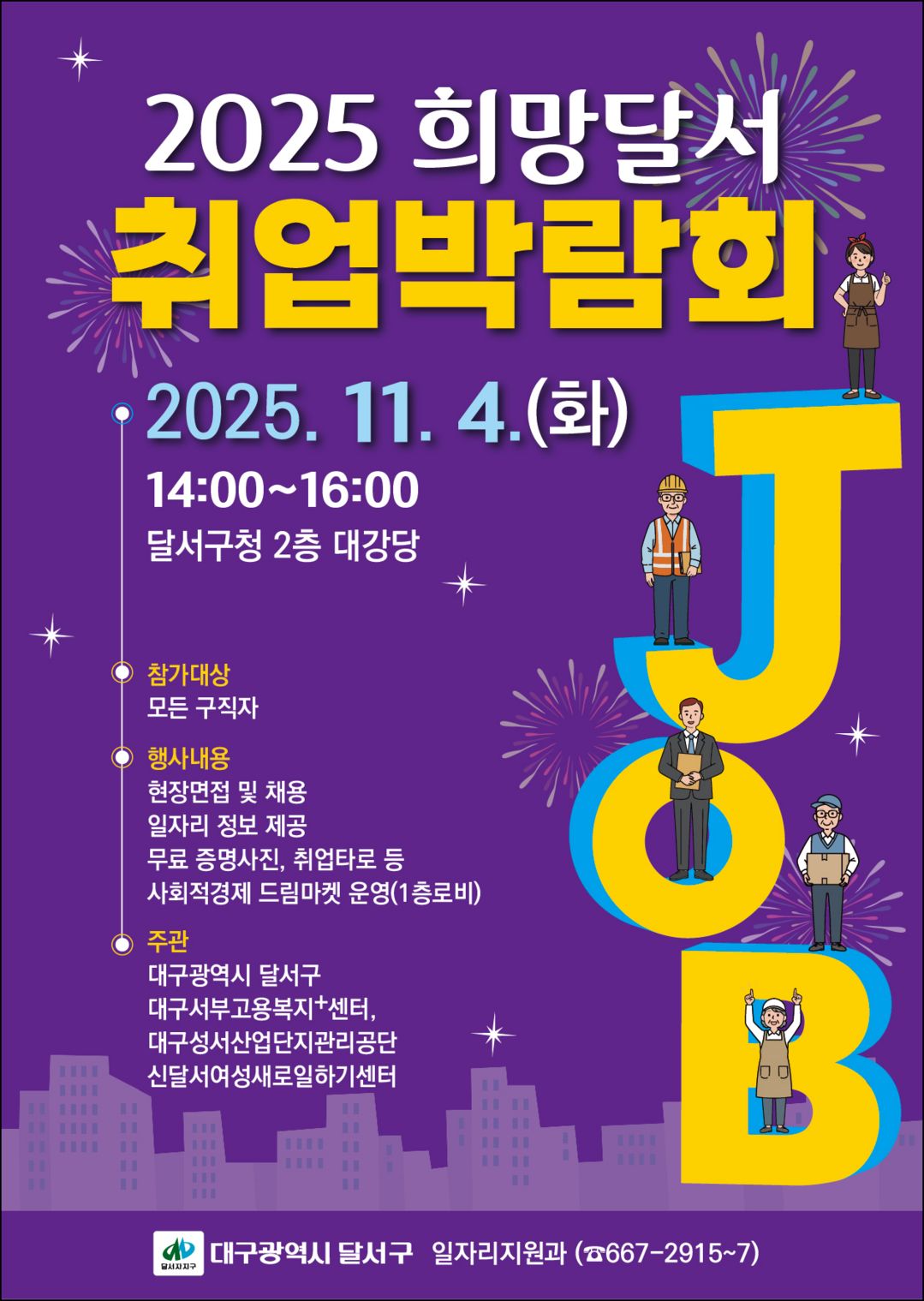 [로컬세계 = 박세환 기자] 대구시 달서구는 오는 11월 4일 오후 2시부터 4시까지 구청 2층 대강당에서 ‘2025 희망달서 취업박람회’를 개최한다고 29일 밝혔다.
