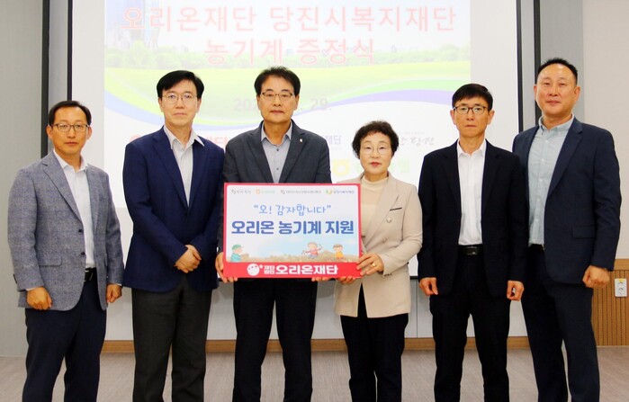 ▲ 오리온그룹-당진시복지재단 농기계 증정식(왼쪽부터) 권혁용 오리온 AGRO팀 상무, 최범림 오리온재단 사무국장, 강도순 당진시 순성농협 조합장, 양기림 당진시복지재단 이사장, 신낙현 당진시청 농식품유통과장, 유광근 당진시해나루조합공동사업법인 대표. 오리온 제공 |