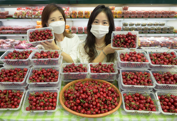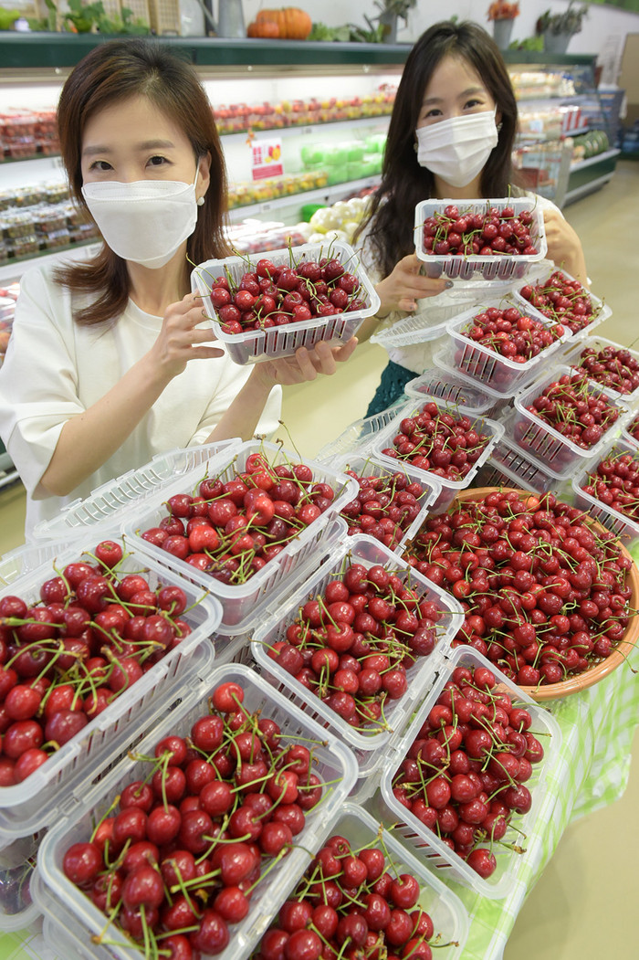 | ▲15일 서울 서초구 농협 하나로마트 양재점에서 모델들이 올해 첫 출하된 과일의 다이아몬드라 불리는 ‘체리’를 소개하고 있다. |
