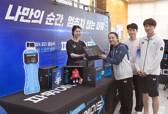 ▲ 2024 파리올림픽 공식 스포츠음료 파워에이드가 20일 오전 충청북도 진천군에 위치한 진천 국가대표선수촌을 찾아 국가대표 선수들을 응원하고, 선수들을 위해 특별히 마련한 파워에이드 스페셜 기프트를 전달했다. (왼쪽부터)탁구 국가대표 조대성, 전지희, 장우진 선수.(사진제공=한국 코카-콜라사) |