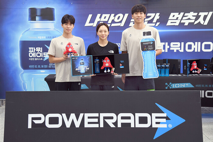 ▲ 2024 파리올림픽 공식 스포츠음료 파워에이드가 20일 오전 충청북도 진천군에 위치한 진천 국가대표선수촌을 찾아 국가대표 선수들을 응원하고, 선수들을 위해 특별히 마련한 파워에이드 스페셜 기프트를 전달했다. 수영 국가대표 김민섭, 김서영, 이주호 선수가 파워에이드 스페셜 기프트를 들고 포즈를 취하고 있다.(사진제공=한국 코카-콜라사) |