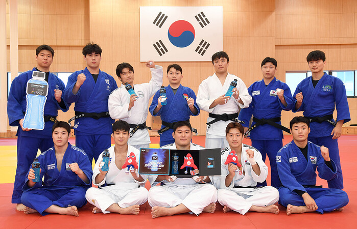 ▲ 2024 파리올림픽 공식 스포츠음료 파워에이드가 20일 오전 충청북도 진천군에 위치한 진천 국가대표선수촌을 찾아 국가대표 선수들을 응원하고, 선수들을 위해 특별히 마련한 파워에이드 스페셜 기프트를 전달했다. 안바울, 김민종, 이준환 등 유도 국가대표 선수들이 파이주 인형 및 파워에이드를 들고 사진을 촬영하고 있다.(사진제공=한국 코카-콜라사) |