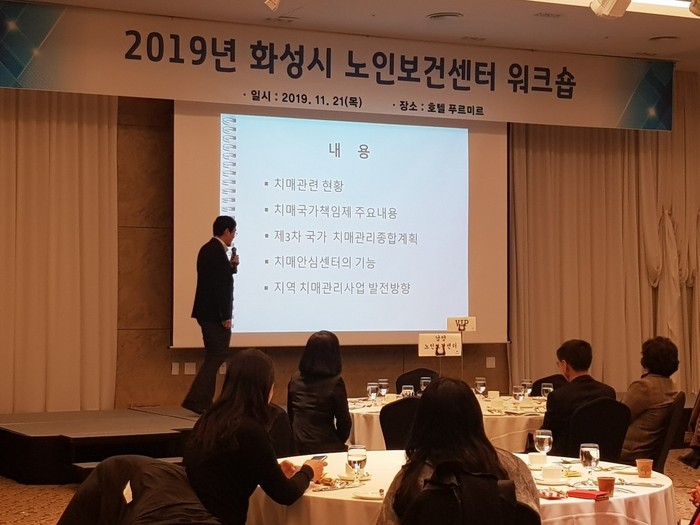 이날 워크숍에는 60여명, 김장수 화성시보건소장, 김우정 전 경기도 광역 치매안심센터장, 노인보건센터장 및 직원 등 60여 명이 참석했다.