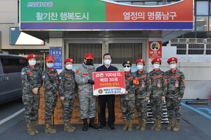[로컬세계 박세환 기자]대구 남구청(구청장 조재구)은 지난 23일, 해병대 대구연합회 여성단원 봉사단(단장 이상숙)에서 어려운 이웃들을 위해 라면 100상자와 백미30포(325만원 상당)를 기탁했다고 밝혔다.