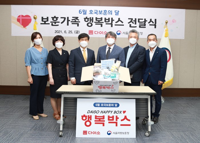 | ▲서울지방보훈청 이성춘 청장(왼쪽에서 세 번째)과 ㈜아성다이소 신호섭 대표(왼쪽에서 네 번째)가 '보훈가족 행복박스 전달식'을 가진 뒤 기념사진을 촬영하고 있다. |