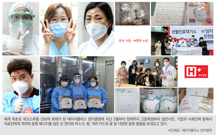 세계 최초로 ‘워크스루 선별진료소’를 선보여 화제가 된 에이치플러스 양지병원에 고등학생부터 일반시민, 기업과 단체 등 전국의 국민들이 격려와 응원 메시지를 담은 편지와 격려카드 그리고 마스크, 빵, 음료, 꽃 등 다양한 응원 용품을 보내 주며 이 병원 의료진에게 따뜻한 마음을 전했다.