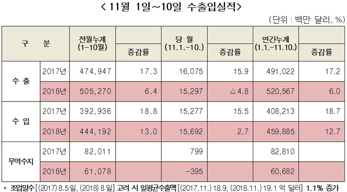 | ▲11월 1일∼10일 수출입실적표.(관세청 제공) |
