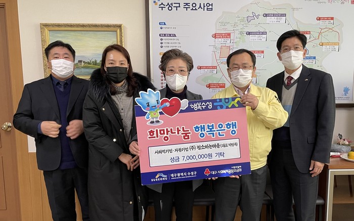 [로컬세계 박세환 기자]대구 수성구는 지난 22일 ㈜청소하는마을(대표 박정옥)에서 구청을 방문해 어려운 이웃을 위해 써달라며 성금 700만원을 전달했다고 23일 밝혔다.