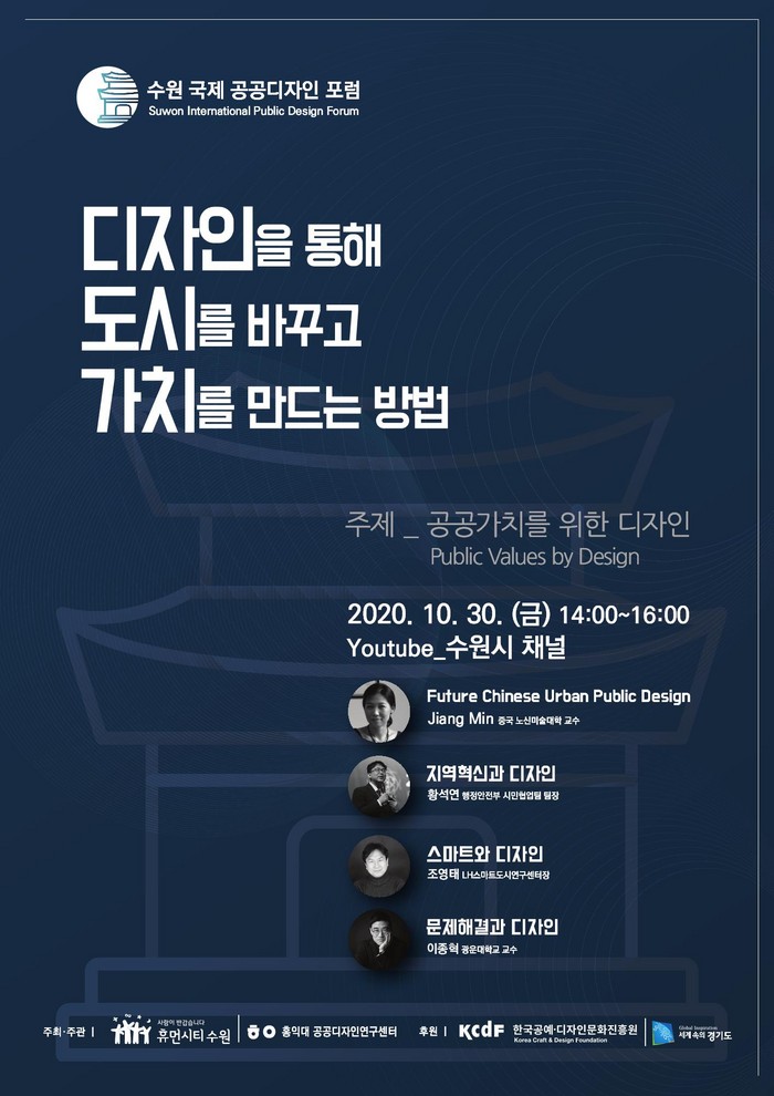 [로컬세계 고용주 기자]경기 수원시는 오는 30일 수원 컨벤션센터에서 ‘2020 국제공공디자인포럼’을 온라인으로 개최한다고 26일 밝혔다. 수원시 유튜브 채널로 오후 2시~오후 4시 15분까지 온라인 중계한다.