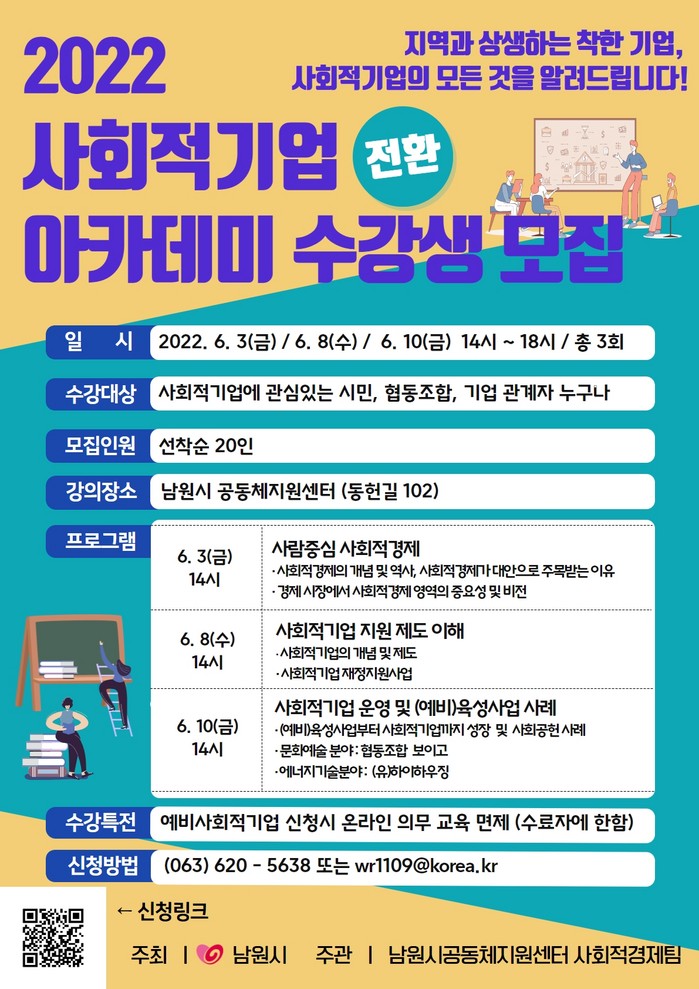 [로컬세계 이태술 기자]전북 남원시(시장 이환주)는 사회적경제 저변확대와 예비 사회적기업 발굴을 위한 ‘남원시 사회적기업 전환아카데미’ 수강생을 이번 달 27일까지 모집한다고 17일 밝혔다.