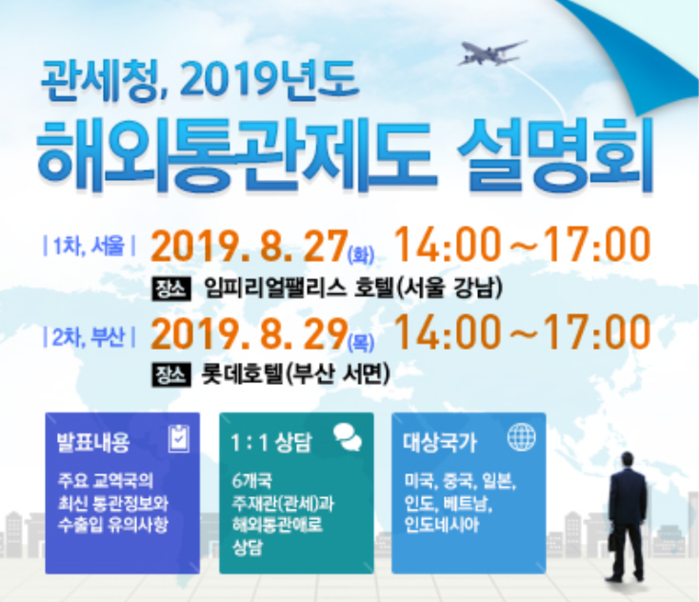 [로컬세계 박민 기자]관세청은 내달 27일과 29일 서울 임피리얼팰리스호텔과 부산 롯데호텔에서 수출기업 및 물류업체 관계자 등을 대상으로 ‘해외통관제도 설명회’를 개최한다고 밝혔다.