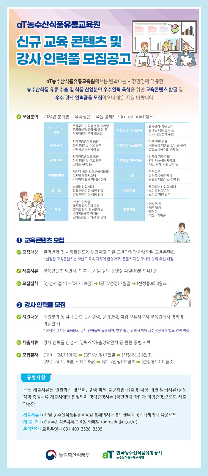 한국농수산식품유통공사(사장 김춘진) 농수산식품유통교육원은 대한민국 농수산식품 유통과 수출·식품산업의 미래 인재 육성을 위한 ‘신규 교육콘텐츠’와 ‘우수 강사 인력풀’을 오는 7월 19일까지 모집한다.