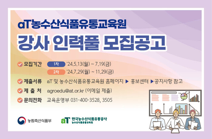 아울러, 농수산식품유통교육원 강사 인력풀 모집도 함께 진행된다. 본 모집은 교육원이 운영하는 교육과정의 강의가 가능한 인원을 대상으로 하며, 인력풀에 등록된 강사는 올해 하반기부터 교육원 강사로 활동할 수 있다.
