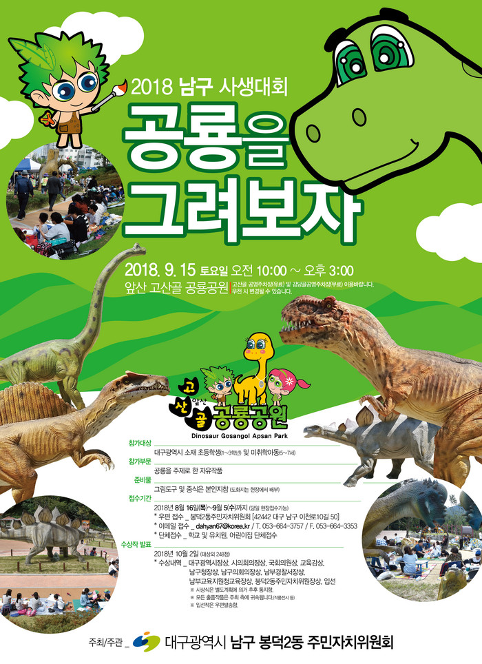 지난 해에 이어 올해 두 번째로 이번 사생대회는 봉덕2동 주민자치위원회 주최, 남구청과 봉덕2동 행정복지센터 후원으로 9월 15일 오전 10시~오후 3시까지 앞산 고산골 공룡공원에서 개최된다.