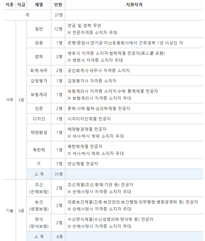 | ▲하반기 신입직원 공개채용 모집분야 및 지원자격. |