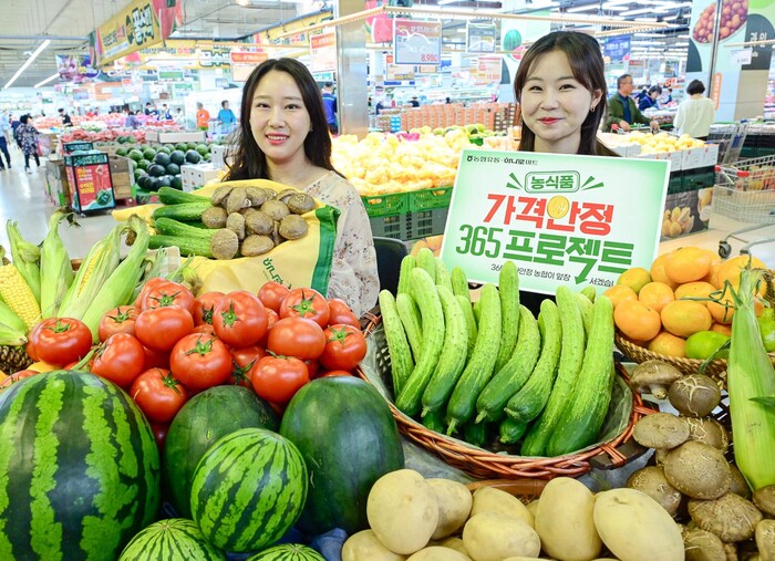 ▲5일 서울 서초구 하나로마트 양재점 모델들이 '농식품 가격 안정 365!' 행사를 소개하고 있다. |