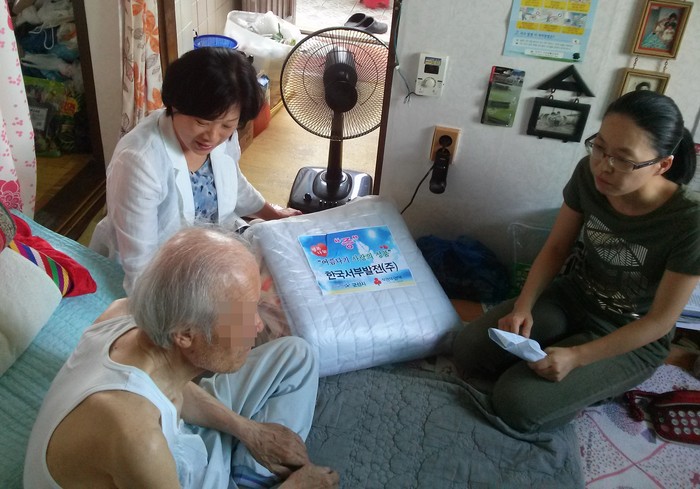 ▲지난해 전북 군산시 공무원들이 저소득층 어르신 집을 방문해 ‘여름나기 사랑의 성품’으로 받은 이불을 전달하고 있다. |