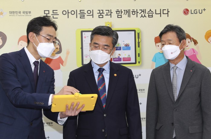 | ▲5일 서울 용산구 소재 국방부에서 열린 ‘초등 군인 자녀 교육 지원을 위한 업무협약’에 참석한 LG유플러스 문현일 아이들나라사업 담당(왼쪽)이 국방부 서욱 장관(가운데)과 LG유플러스 황현식 사장에게 'U+초등나라'를 소개하고 있다. [LG유플러스 제공] |