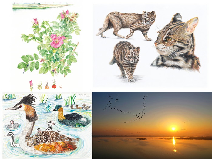 ▲2020 화성호 시민참여 공모전 대상 수상작. 왼쪽 위부터 시계방향으로 세밀화 성인부 대상 <해당화와 곤충 친구들(김정미)>, 세밀화 중고등부 대상 <삵(이현지)>, 세밀화 초등부 대상 <뿔논병아리와 논병아리(홍다현)>, 드론 사진 대상 <화성호 일출(정병규)> |