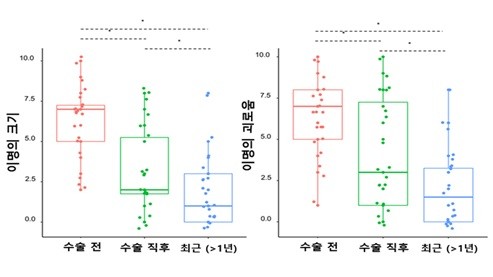 ▲ 수술 전후 이명의 크기와 이명의 괴로움 정도를 비교 평가한 결과 |